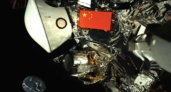 На недавно опубликованном снимке, полученном камерой наблюдения, установленной на роботизированном манипуляторе зонда, хорошо видны пятизвездочный красный флаг КНР и белая возвращаемая капсула на фоне далекой голубой Земли.