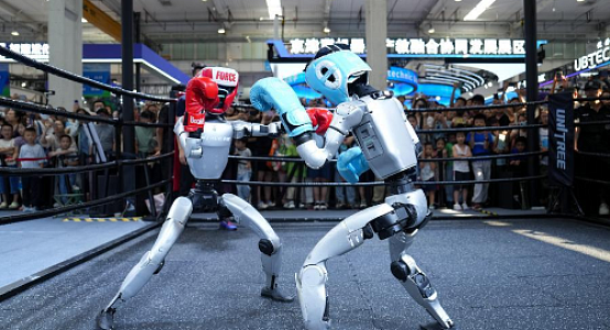 (НА СНИМКЕ: В выставочном зале Всемирной конференции по робототехнике, проходящей в Пекине, зрители в августе прошлого года наблюдали за поединком роботов-боксеров на ринге при стенде компании Unitree Robotics. Фото: Синьхуа)